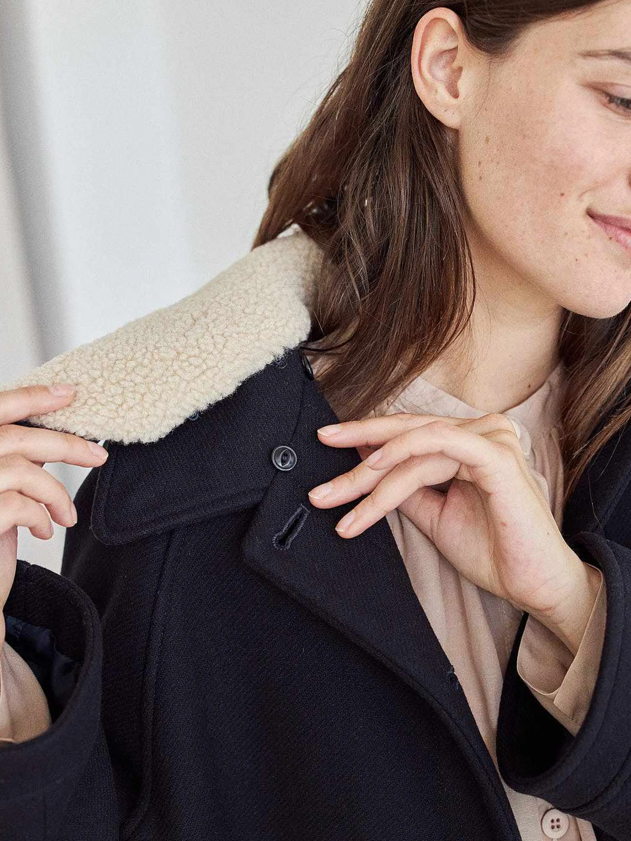 Eine Klassische Button-Down-Wolljacke, Ideal Fur Saisonubergreifende Und Milde Winterkleidung. Komplett Gefuttert Mit Abnehmbarem Sherpa-Kragen, Komplett Mit Zwei Aufgesetzten Taschen Und Steinnuss-Knopfdetails.