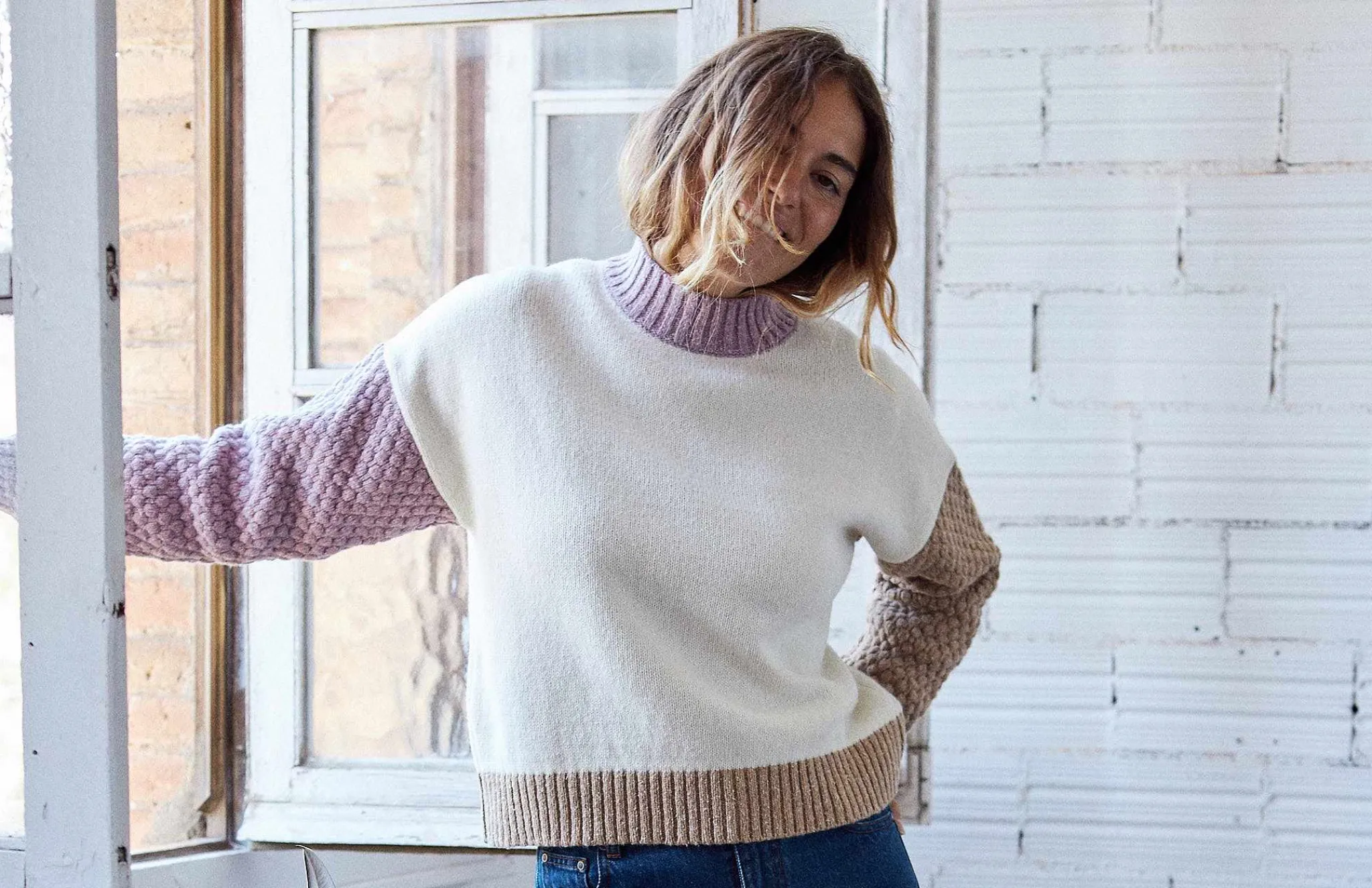 Ein Umweltfreundlicher Pullover, Der Vollstandig Aus Recyceltem Stoff Besteht. Ein Gemutlicher Und Langlebiger Strick Mit Kontrastierenden Tonen. Entworfen Mit Hohem Ausschnitt, Gerippten Kanten Und Schonen Strukturierten Armeln.