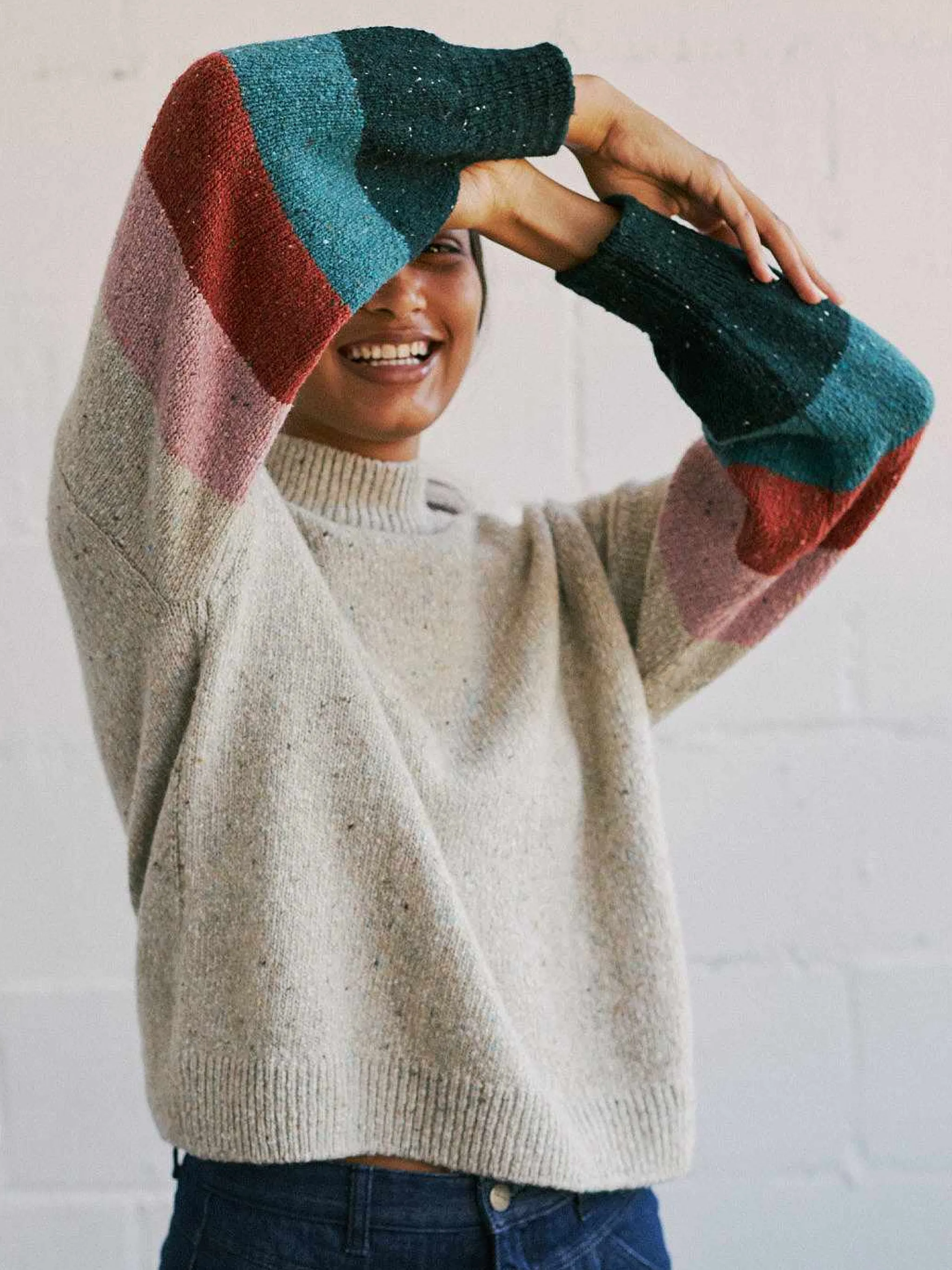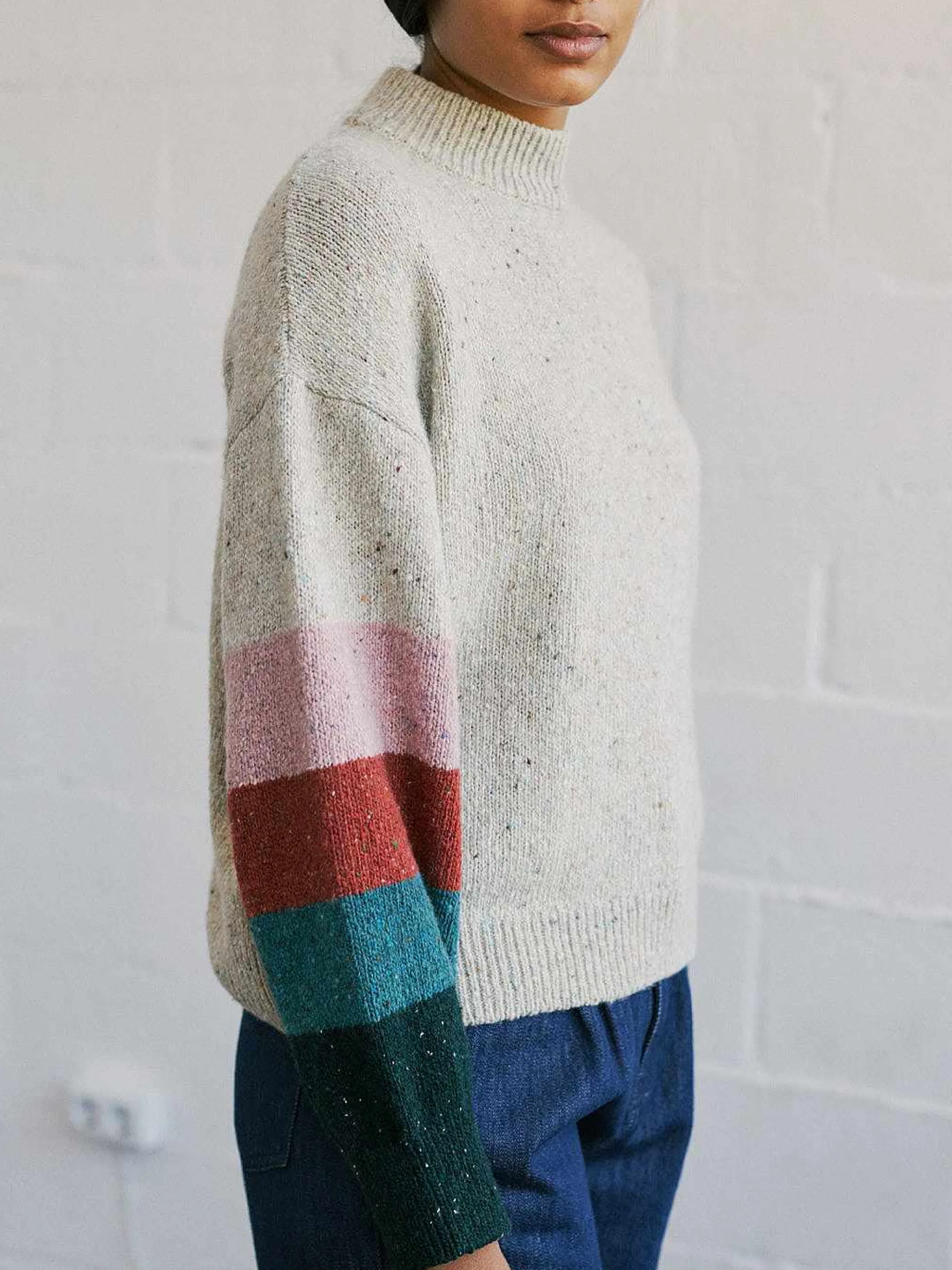 Die Weichsten Recycelten Materialien Werden Mit Wunderschonen Farbigen Noppen Ubersat, Um Den Mittelschweren Tiberina-Strick Zu Schaffen, Der Einen Hohen Halsausschnitt Und Gerippte Kanten Fur Zusatzlichen Komfort Bietet.