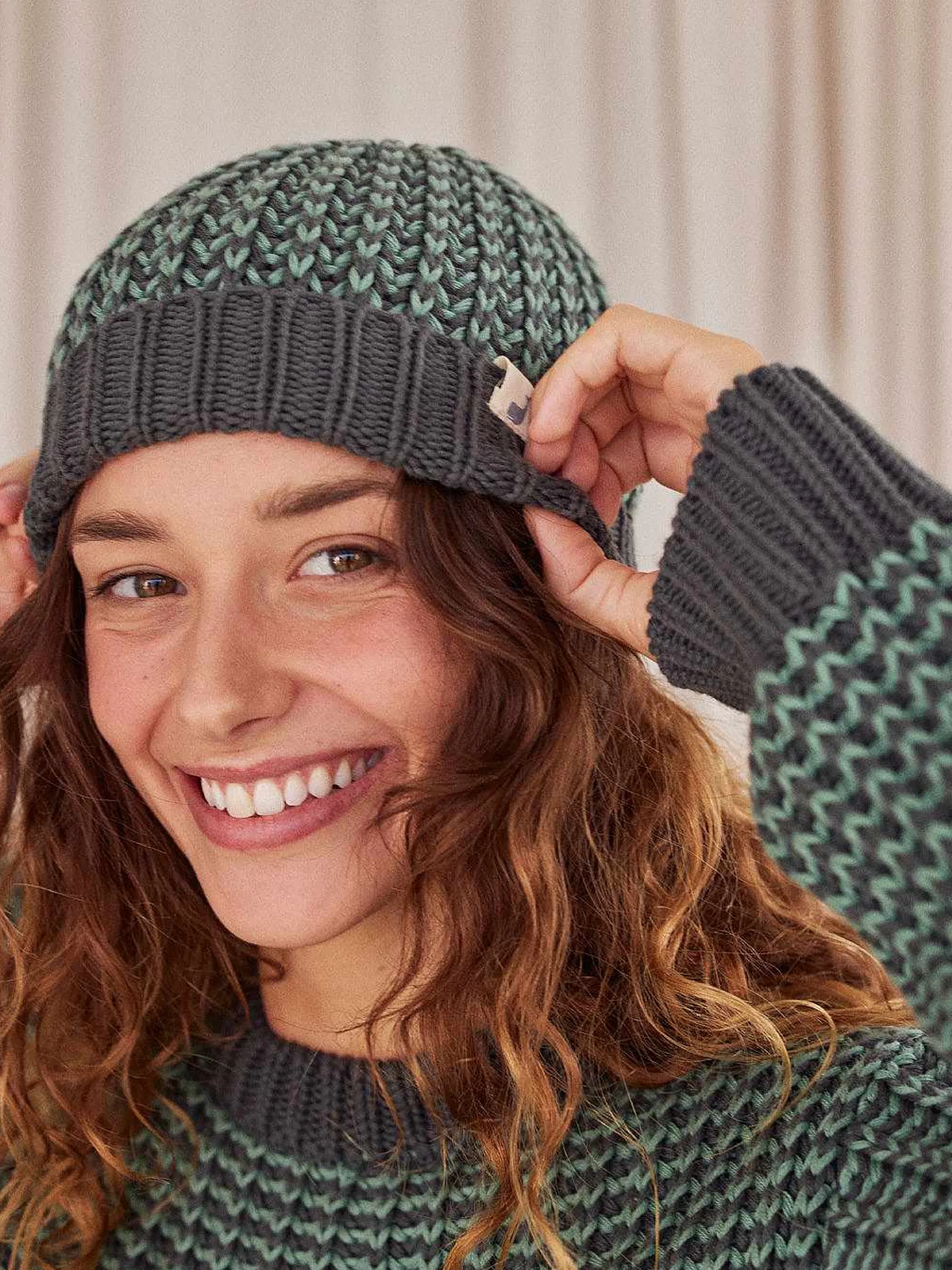 Die Katiu Ist Eine Kurze Mutze Aus Bio-Baumwolle, Die Ihnen Raum Gibt, Ihre Winterlocken Zur Schau Zu Stellen Und Gleichzeitig Kuschelig Warm Zu Bleiben. Verfugt Uber Ein Geripptes Muster Fur Einen Auffalligen Welleneindruck.